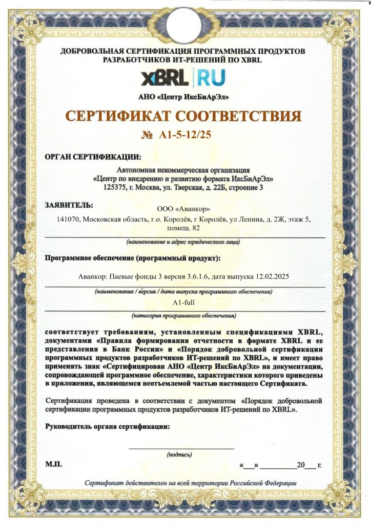 По итогам тестирования Аванкор: Паевые фонды 3 получил сертификат соответствия XBRL по категории А1-full (наивысший) для НО АИФ и УК.